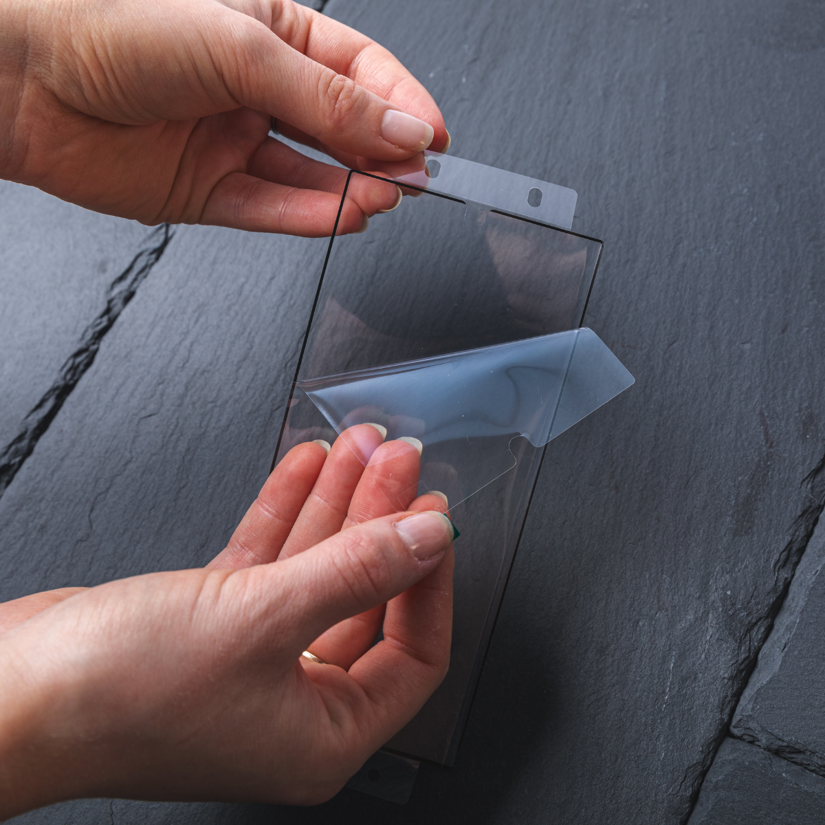 Carefully peel off the top layer using the screen protector tabs.