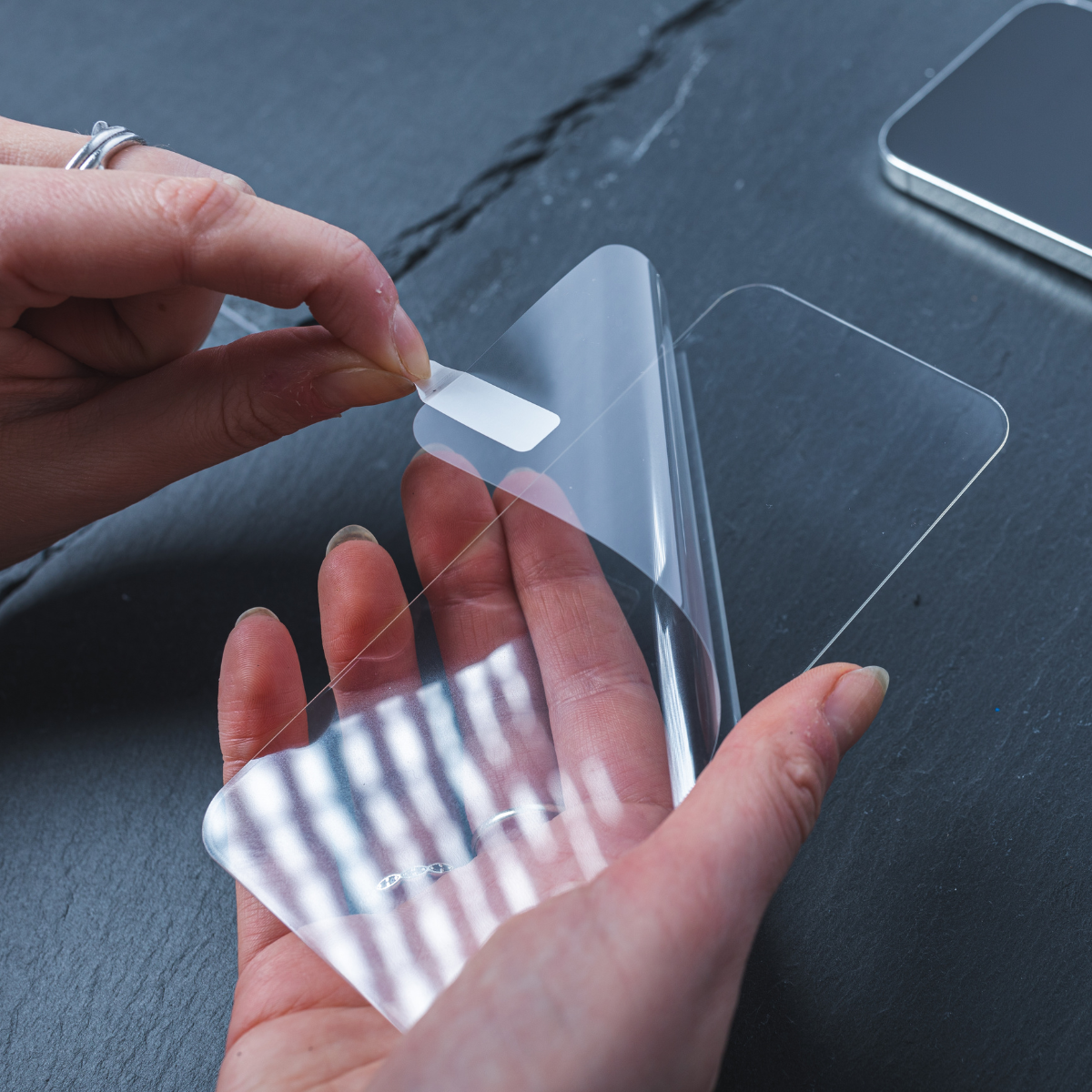 Pull back and remove the protective film from the tempered glass screen protector.